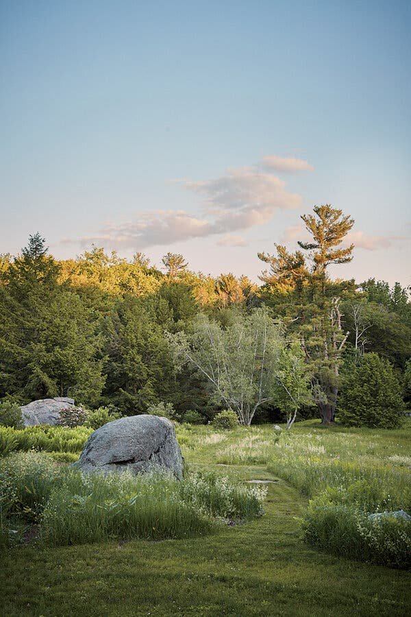 While such color and profusion certainly seduce, it is Pearson’s modification of the shaded woodland area closest to the eastern side of the house that is arguably his most expressive gesture at Robin Hill. The key to making such dense shade welcoming, says Pearson, is to intersperse human interventions at perfect intervals, just enough “to make the place feel safe.” A few trees were sacrificed to allow others to thrive, and the path is marked by a fallen white pine fashioned into a bench. Beyond, in the shadows, lies a 15-foot-tall conical cairn — a traditional pile of stones in a formation that has ancient Scottish roots — created by Stephen Bundschuh, a local stonemason. Surrounded by a low stand of epimedium that in coming years will spread out amid the understory detritus, the sculpture rises like a mysterious prehistoric marker. Further on, a circle made of logs and stones opens slowly, to the far end of the meadow, with a mowed path leading back to the house. Such in-between moments — the forest canopy giving way to tall pasture, the amber lights of home in the gauzy distance — are Pearson’s favorites. “It’s always the frayed edges that are important,” he says. “That’s where the most interesting things happen.”